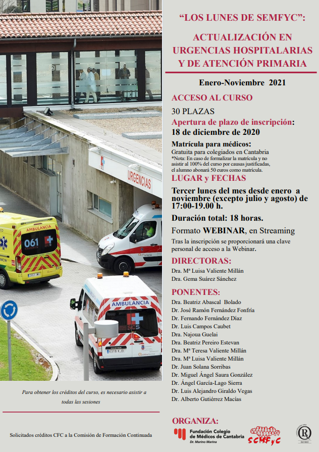 La Sociedad Cántabra de Medicina Familiar y Comunitaria (SCMFyC), con la colaboración del Colegio Oficial de Médicos de Cantabria comienza en enero de 2021 un curso de "Actualización en Urgencias Hospitalarias y de Atención Primaria".